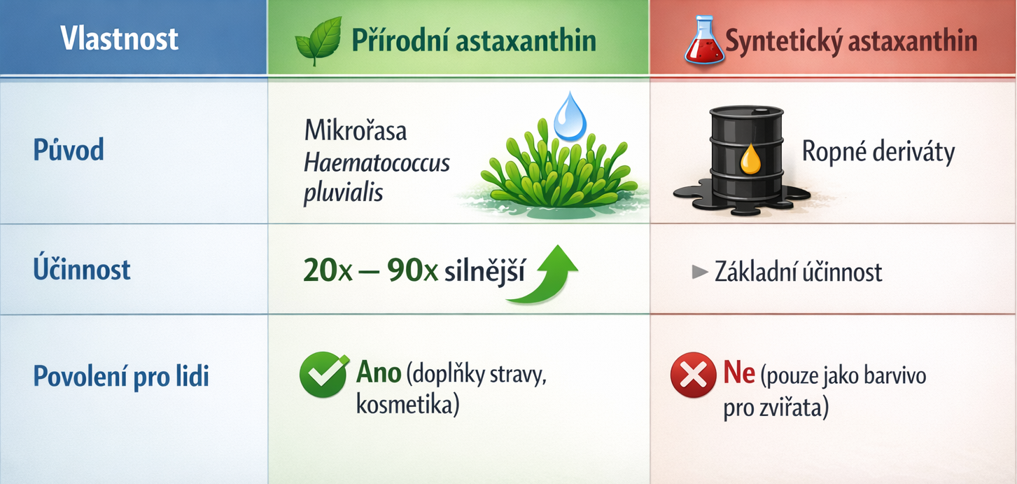 Jak vidíte, mikrořasa Haematococcus pluvialis je absolutním šampionem – obsahuje až 5000× více astaxanthinu než losos! Proto se stala zlatým standardem pro výrobu kvalitních doplňků.