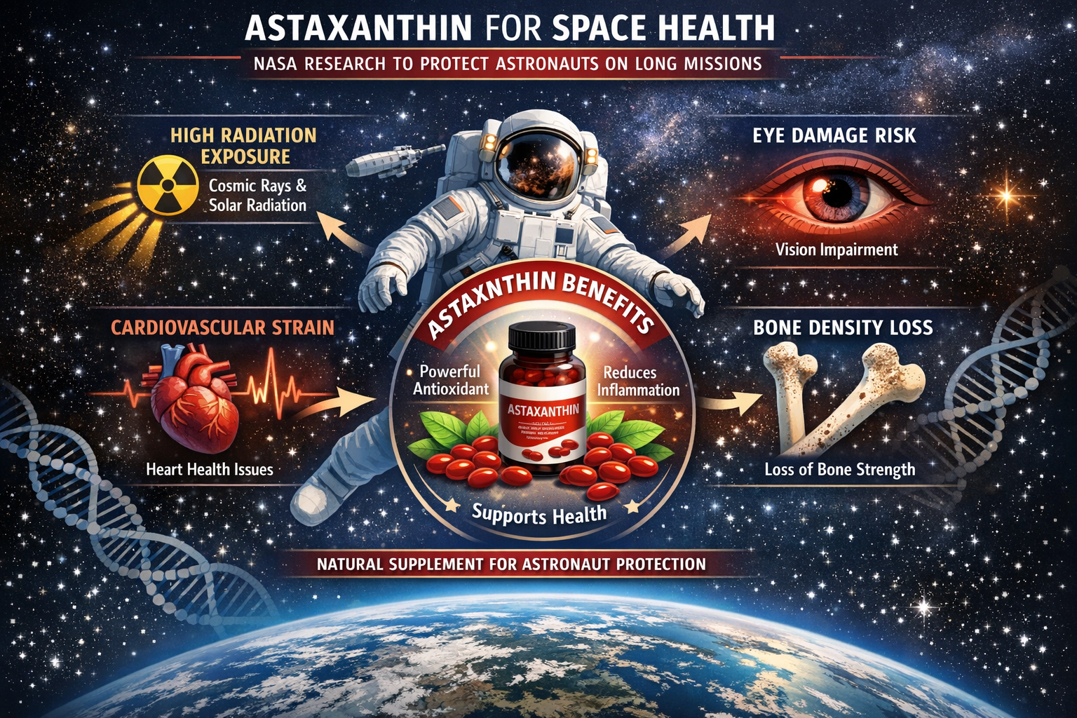 NASA zkoumá potenciál astaxanthinu jako přirozenou podporu pro tyto výzvy. Pokud je dost dobrý pro vesmír, představte si, co může nabídnout vašemu tělu zde na Zemi! 🌍